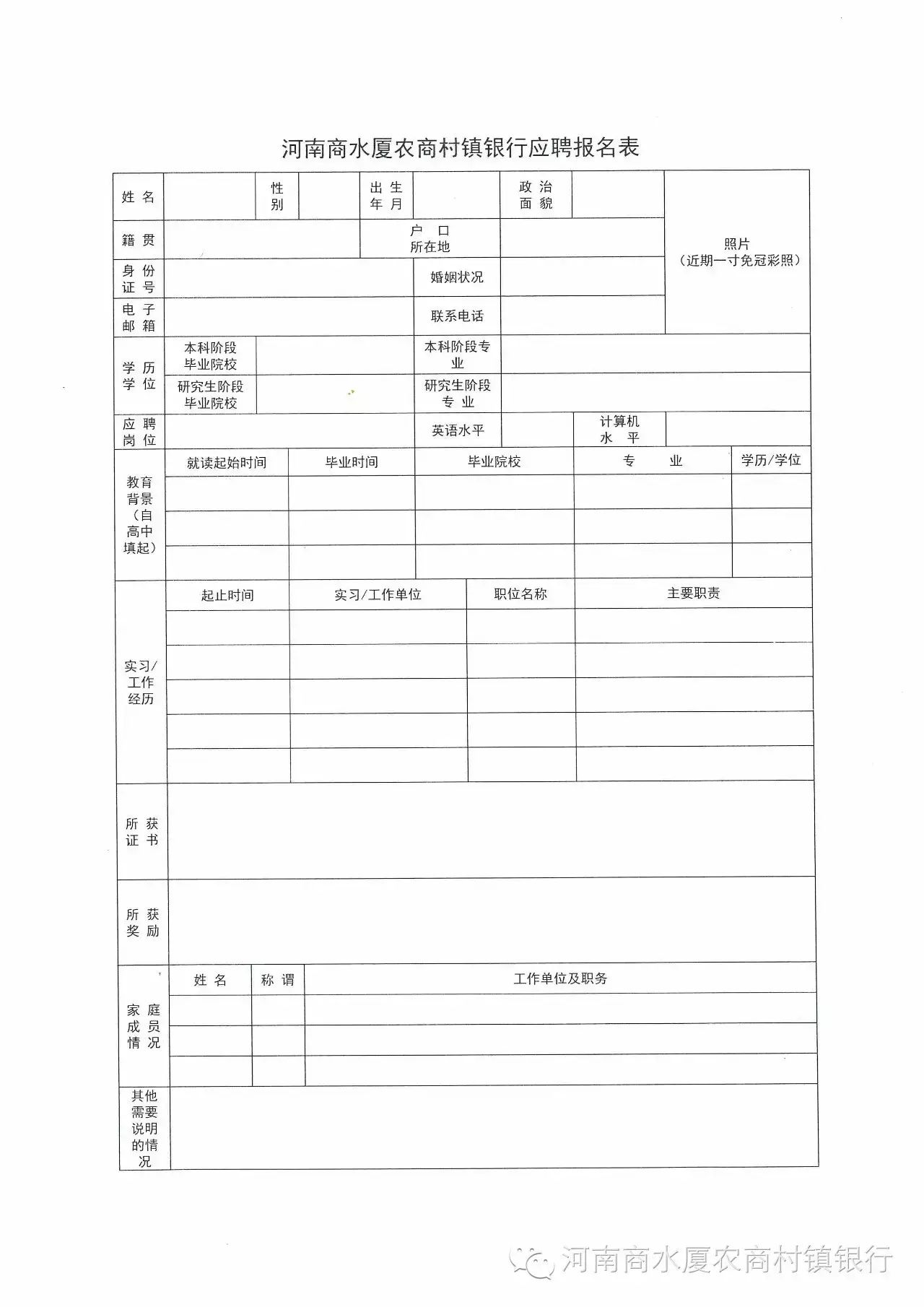 (一)下载填写《河南商水厦农商村镇银行应聘报名表》。进入我行微信公众号,在“关于我们”栏目或直接回复“应聘报名表”下载《应聘报名表》,并如实、详尽填写(微信号:HNSXCB,微信名:河南商水厦农商村镇银行)。